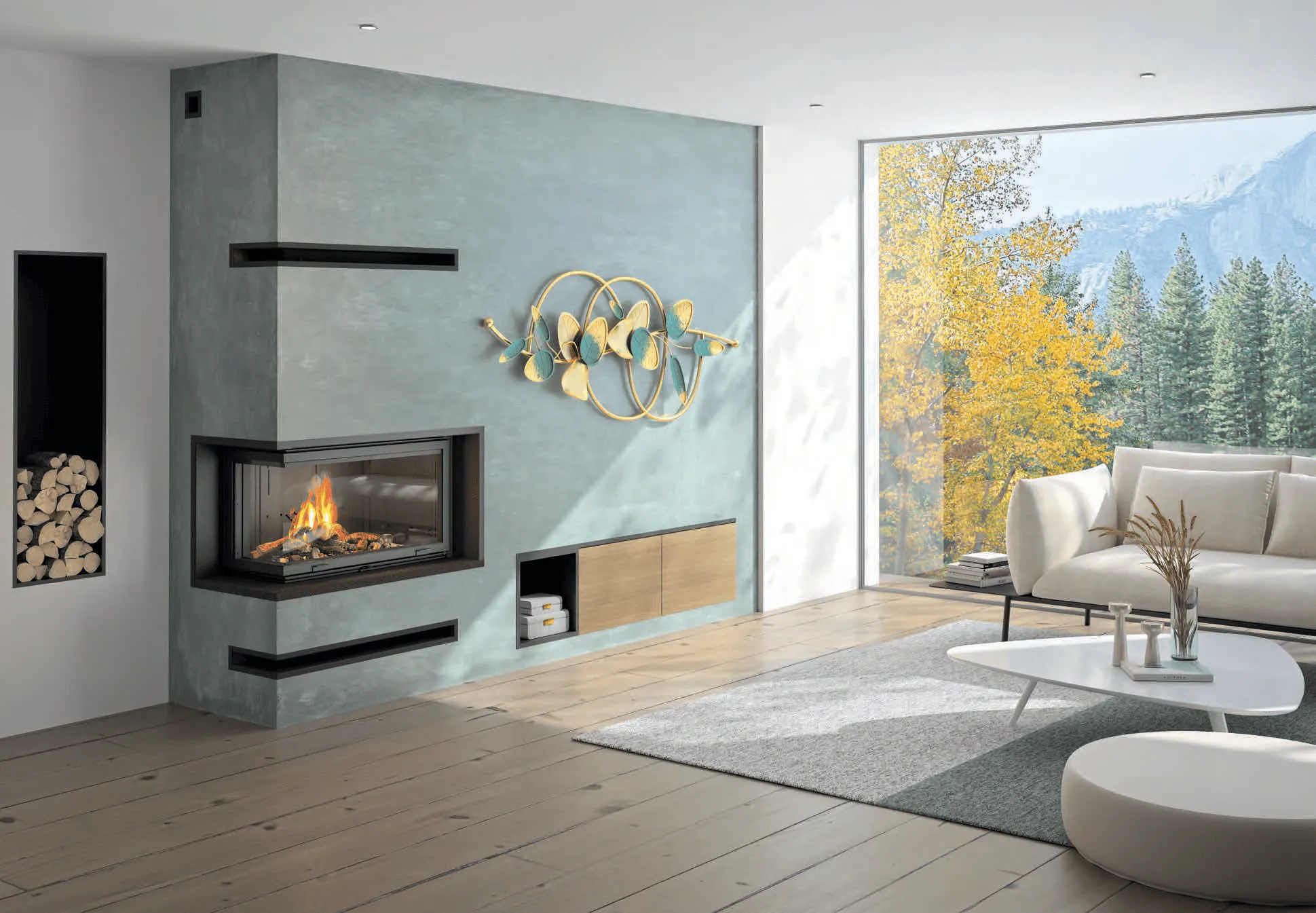 Complétez votre cheminée avec un aménagement bas en mélaminé béton noir mat et mélaminé chêne de Lucombe.